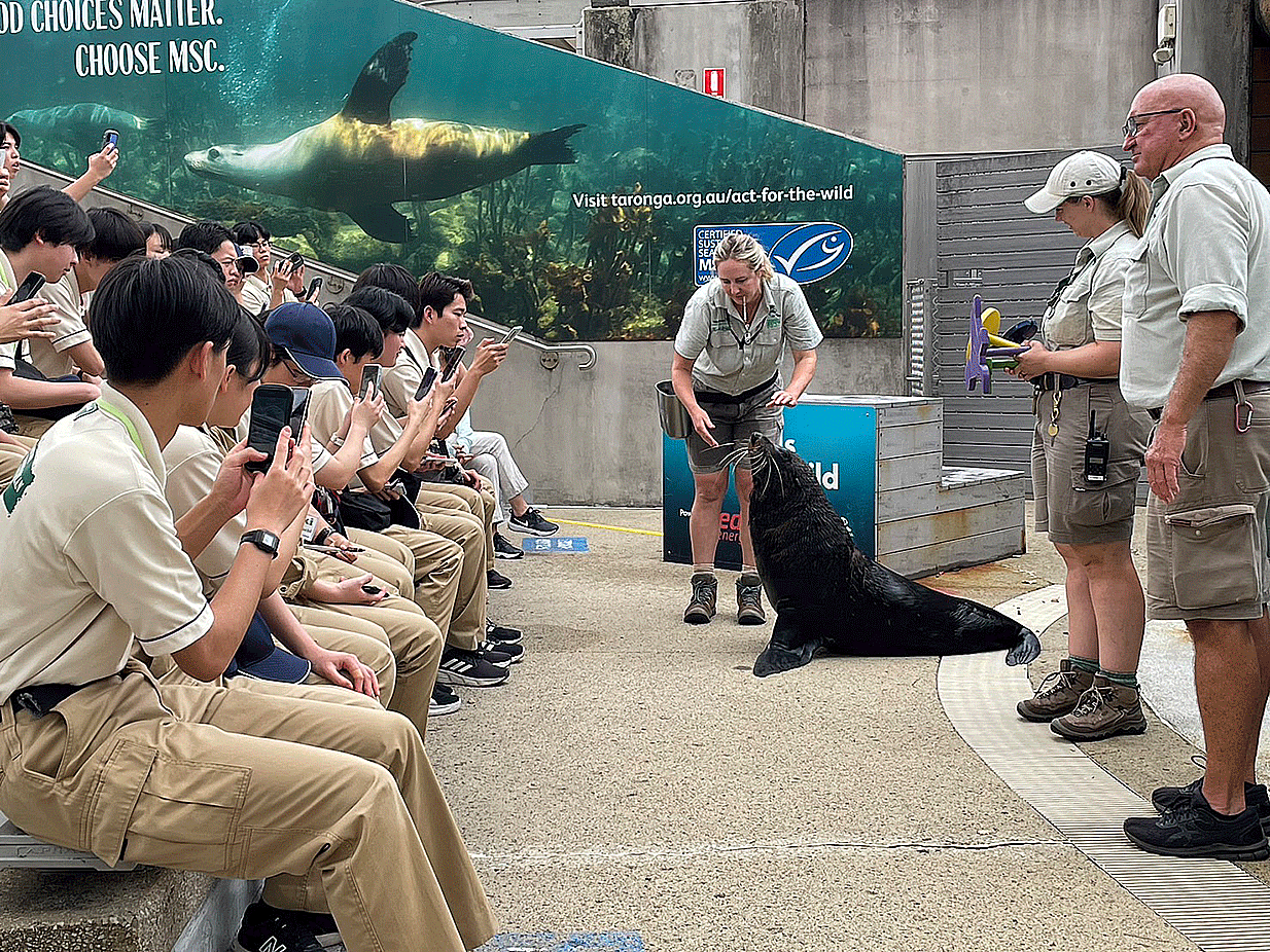 午後は、Seal show、Bird showの見学、アシカのトレーニング見学、生息地を再現した室内での教育プログラムなどなど盛りだくさんの内容でした 最後は、みんなでハイ、シドニー。