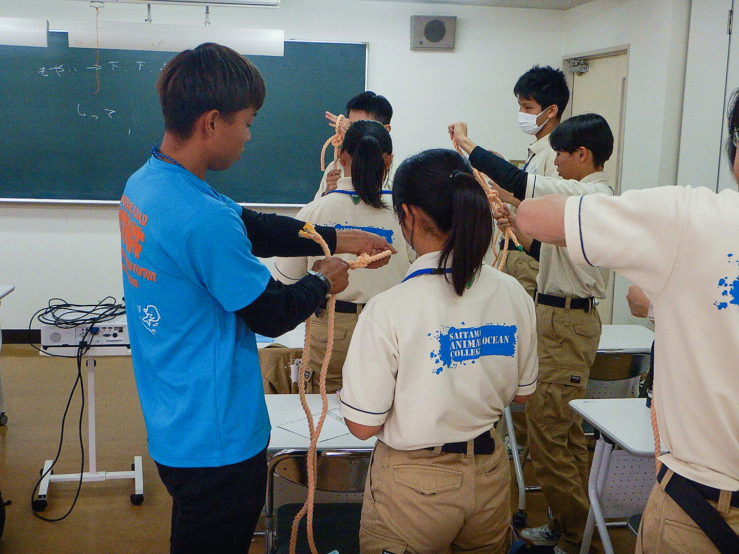特別講義として、ドルフィンファンタジー伊東の山田様にお越しいただきました。 イルカについて、ロープワークの様々な結び方や実践方法のほか、今後の実習における姿勢や考え方などについてご講話いただきました。