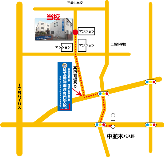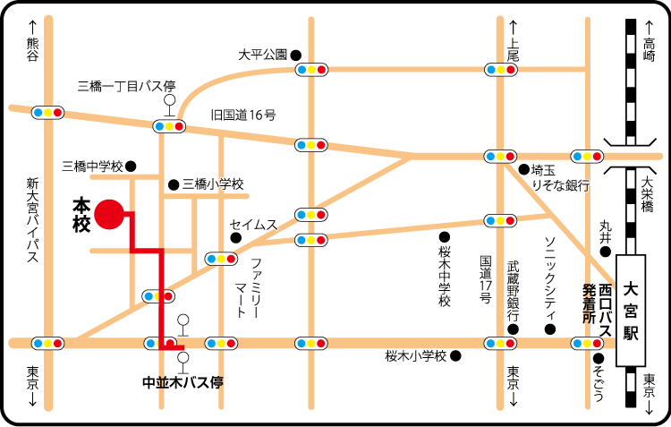 歩いてご来校頂く場合も、大宮駅西口からバス通りをまっすぐ進んで頂き、「中並木」バス停の先の信号を右折して上記の案内の様に進んで下さい。