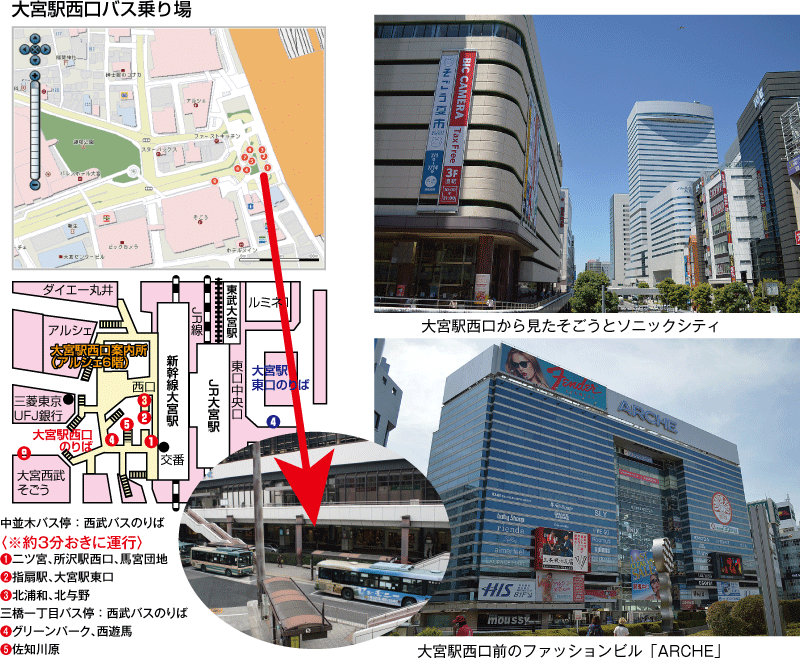 大宮駅西口の上記のバス停から西武バスにお乗り頂き、「中並木」で降車して下さい。