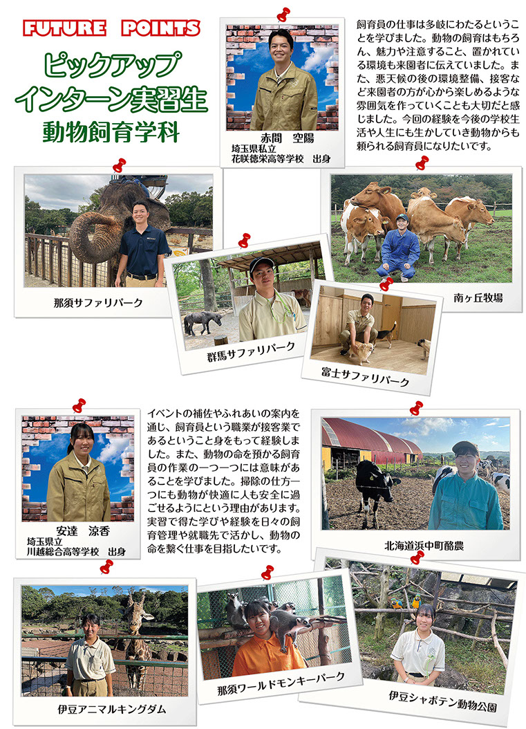 飼育技術の習得はもちろん、インターン実習を通して就職活動を行います。実習先は全国の動物関連施設となります。※全国の動物園、観光牧場、乗馬倶楽部、環境保護施設、ペットショップ、動物病院等(一部抜粋)