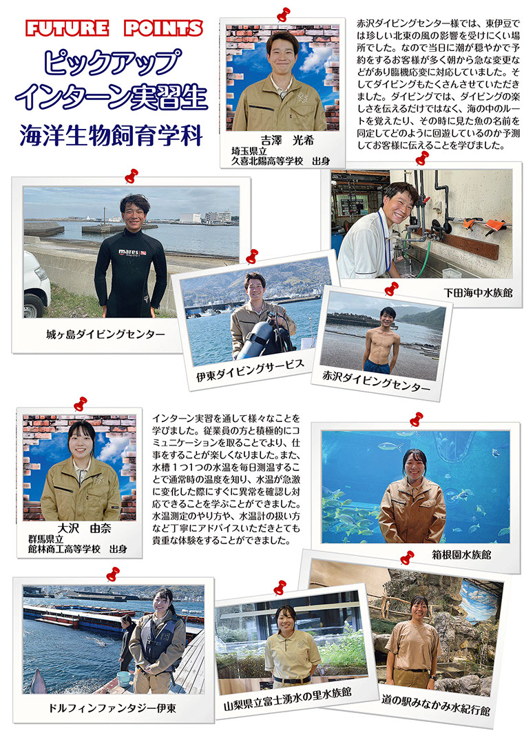 飼育技術の習得はもちろん、インターン実習を通して就職活動を行います。実習先は全国の海洋生物関連施設となります。(一部抜粋)