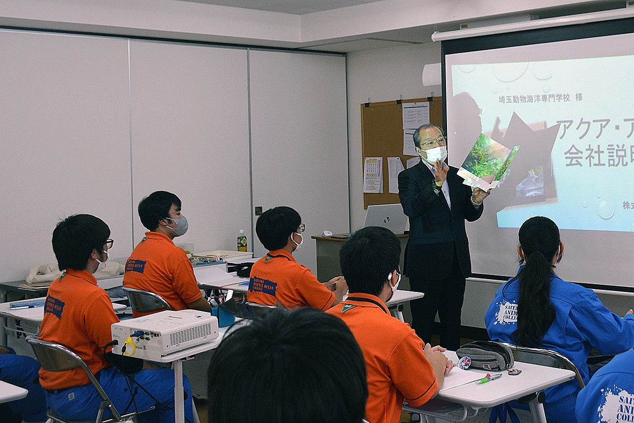 学生への特別講義として、株式会社アクアアートの水落様にお越しいただき、レンタルアクアリウムの仕事についてお話しいただきました。お客様のための水槽づくり、管理の方法、社会人として必要なこと、またSDGsにおける会社としての役割を分かりやすく講義していただきました。
