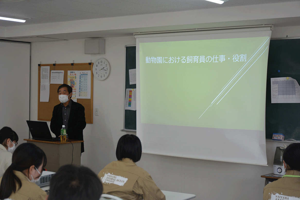 学生への特別講義として、かみね動物園の生江園長にお越しいただきました。学生たちがこの日のために動物イベントを考え、班ごとに発表を行い、アドバイスをいただきました その後、動物園のイベント、飼育員としての役割や目的など盛りだくさんの講義でした。