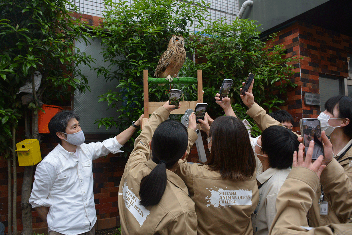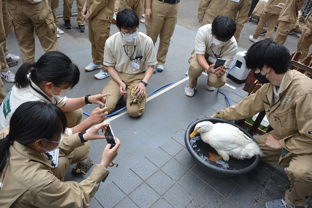 カメラの機能やレンズの種類のレクチャーの後、学生たちのスマホを使用して、動物の撮影方法を実践で学びました。