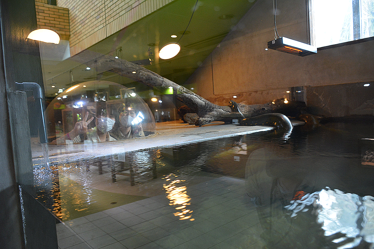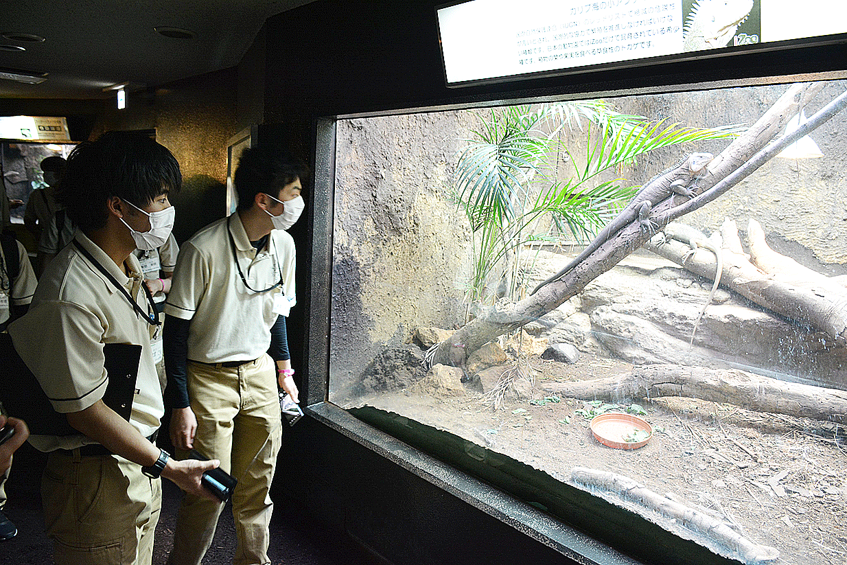 爬虫類の展示に特化した施設内を見学し、レイアウト方法や飼育管理について学びました。