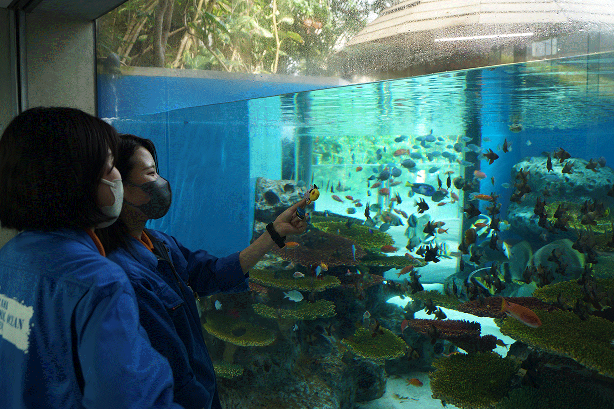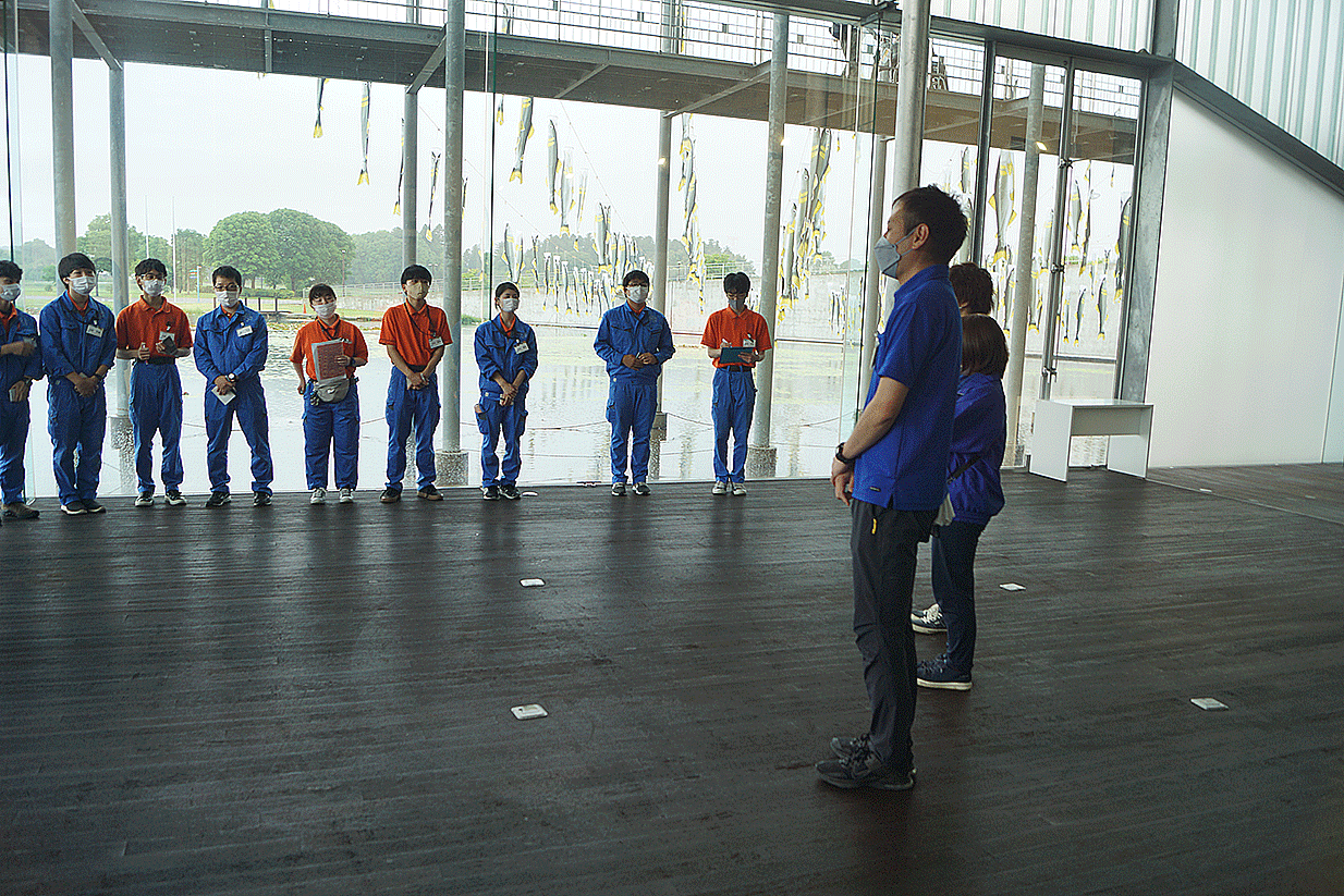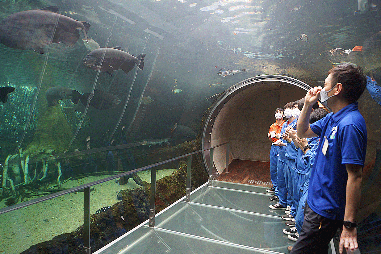 館内の水槽を見学させていただき、生き物の飼育方法や水槽レイアウトなど学びました。見学後に、飼育スタッフ様によるレクチャーをしていただき、なかがわ水遊園としての役割や飼育員の仕事、やりがいについて深く学びました。
