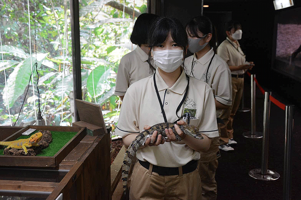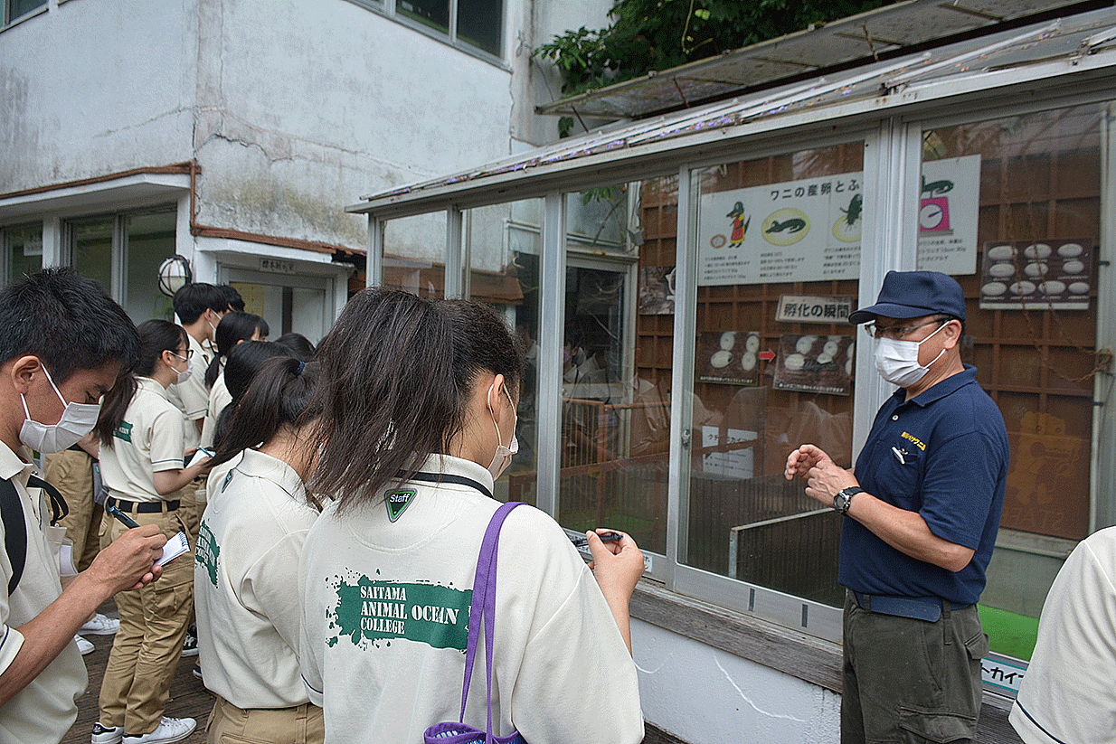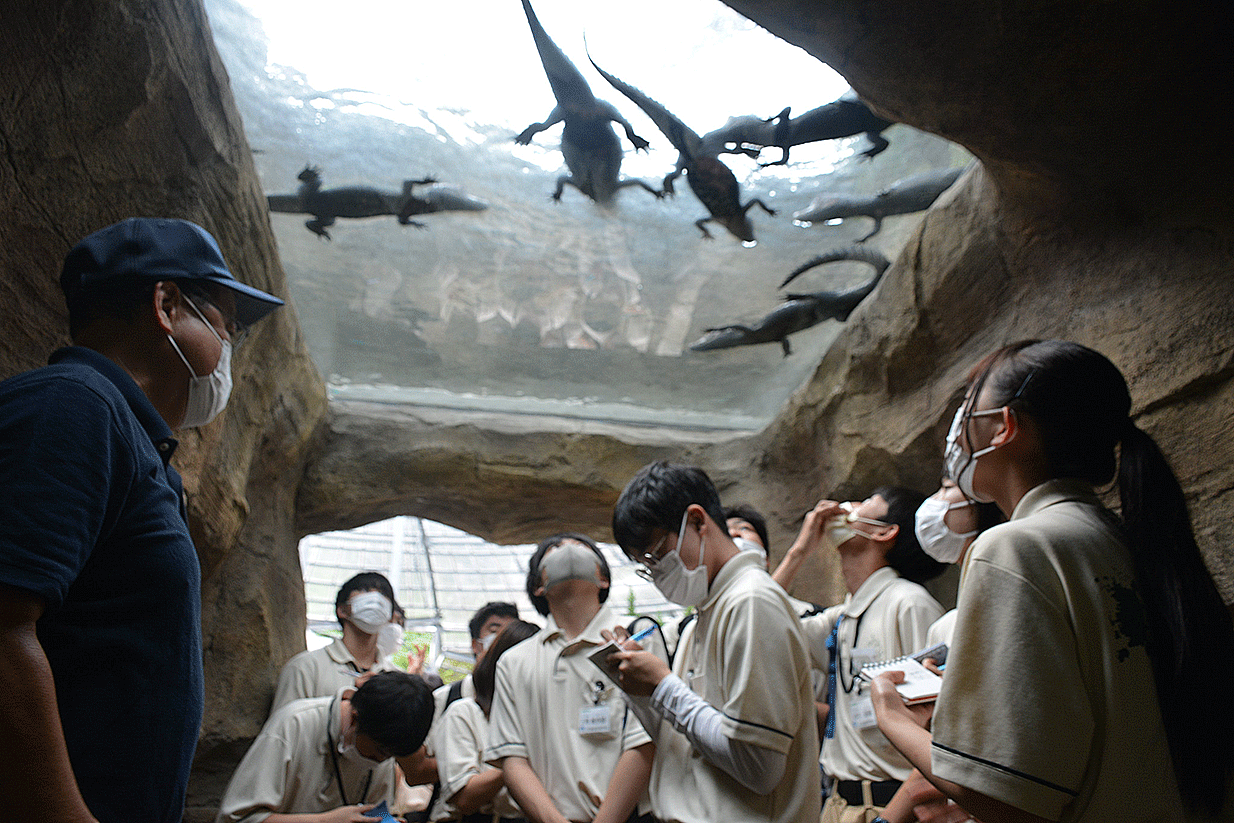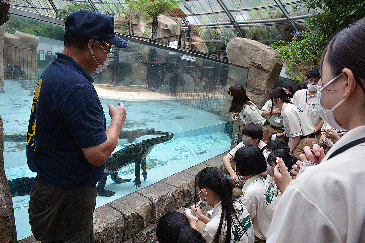 爬虫類の展示に特化した施設内を見学し、レイアウト方法や飼育管理などについて学び、最後は飼育課長の森様によるレクチャーを受けました。