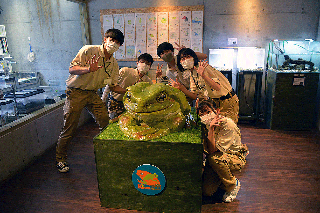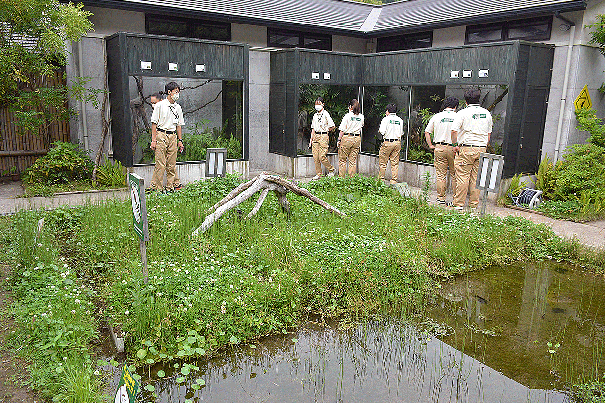カエルの展示に特化した施設内を見学し、レイアウト方法や飼育管理について学びました。