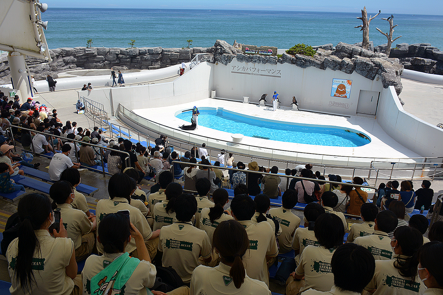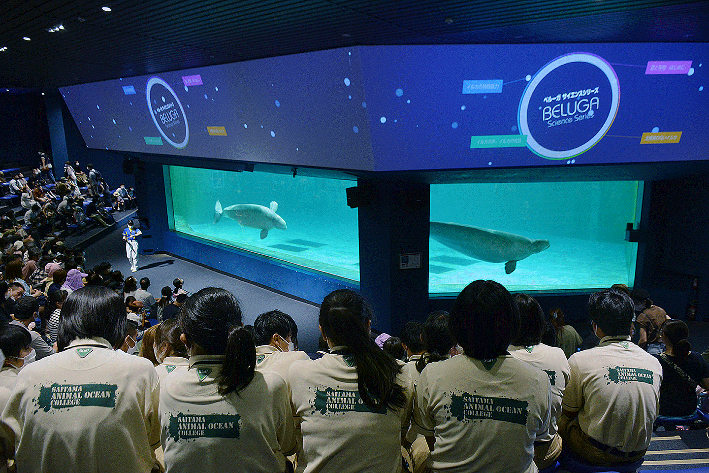 イルカやシャチなど様々なパフォーマンスショーを見学しMCや構成を見学し、その後館内見学行い、展示に工夫点を学びました。