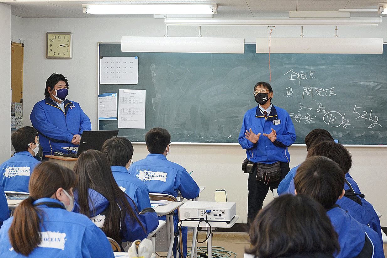 今回は、鴨川シーワールドの関様、加藤様にお越しいただき、水族館で働く仕事についてご講義いただきました 水族館のお話だけでなく、水族館では飼育以外にも数多くの仕事があり、力を合わせて成り立っていることを教えていただきました。