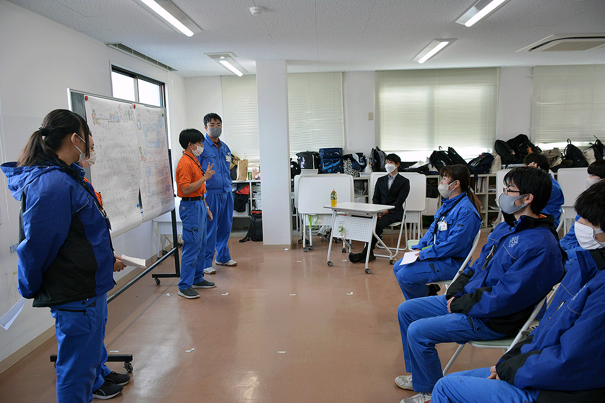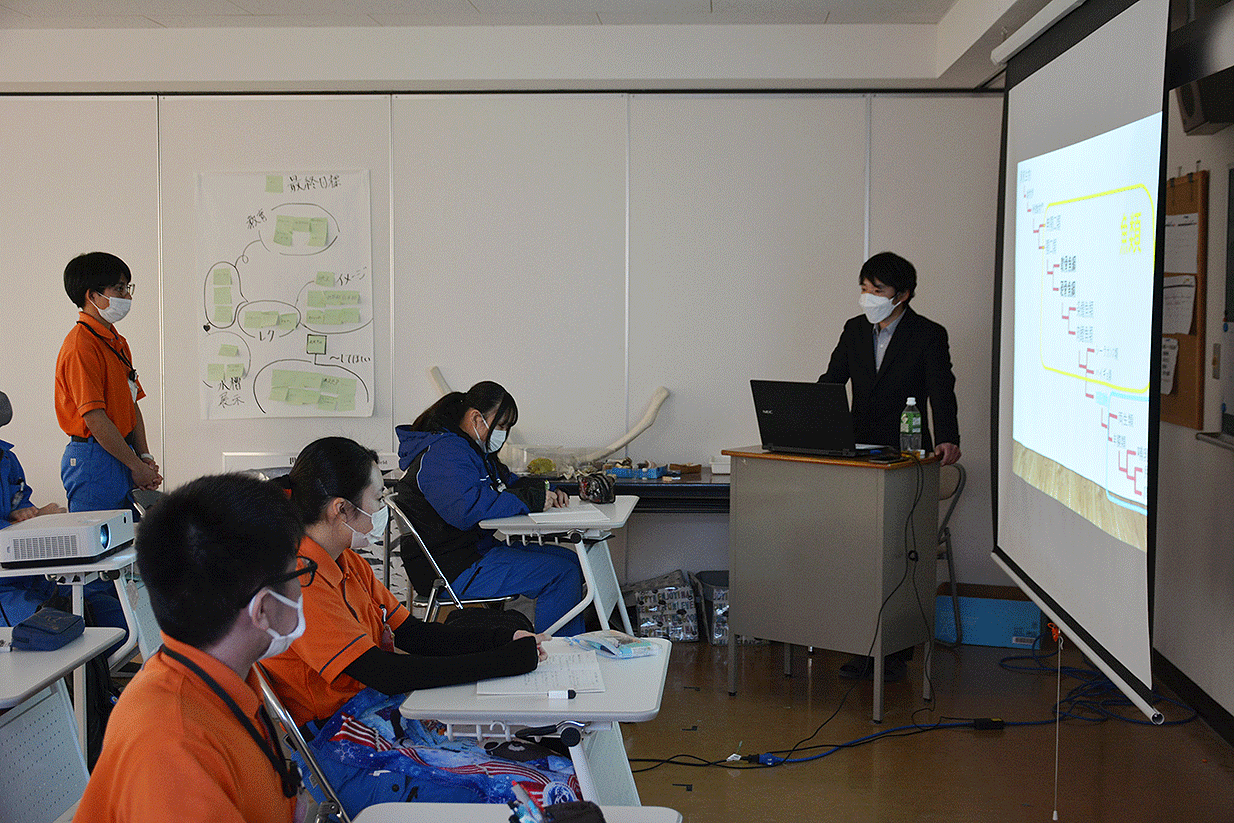 今回は、箱根園水族館の島本飼育長にお越しいただきました。学生たちが班ごとに水族館でのイベントを考え発表し、アドバイスをしていただきました その後は、水族館の仕事について、学生に学んでほしいことなどを講義していただきました。