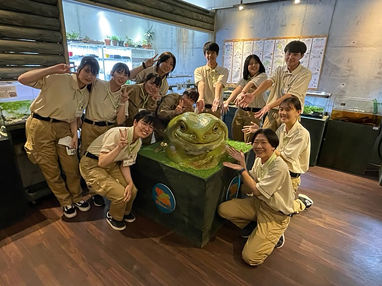 カエルの展示に特化した施設内を見学し、レイアウト方法や飼育管理について学びました。