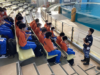 園内見学では、生き物の飼育方法や展示の仕方を学びました。イルカショーを見学した後、本校の卒業生たちによるレクチャーをしていただき、水族館の役割や飼育員の仕事について学びました。
