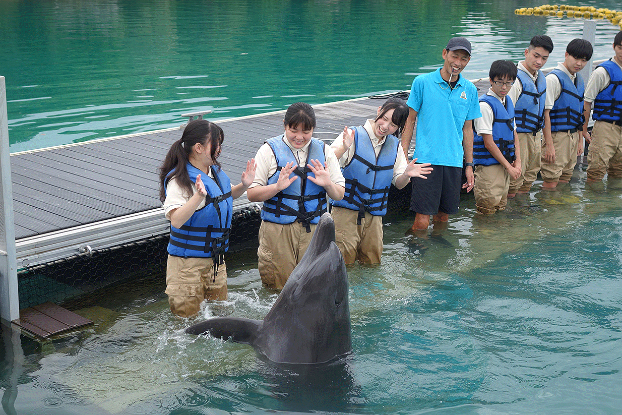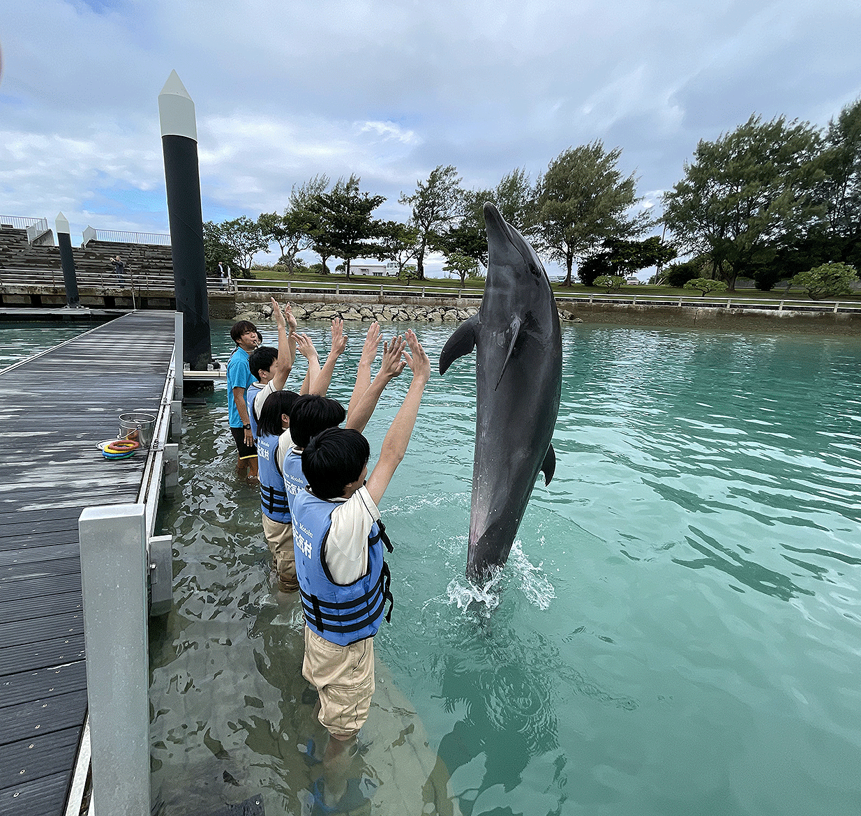 2日目の午前中は、もとぶ元気村へ もとぶ元気村では、イルカについてレクチャーやトレーニング、ドルフィンアシステッドセラピーについて体験しながら学びました。
