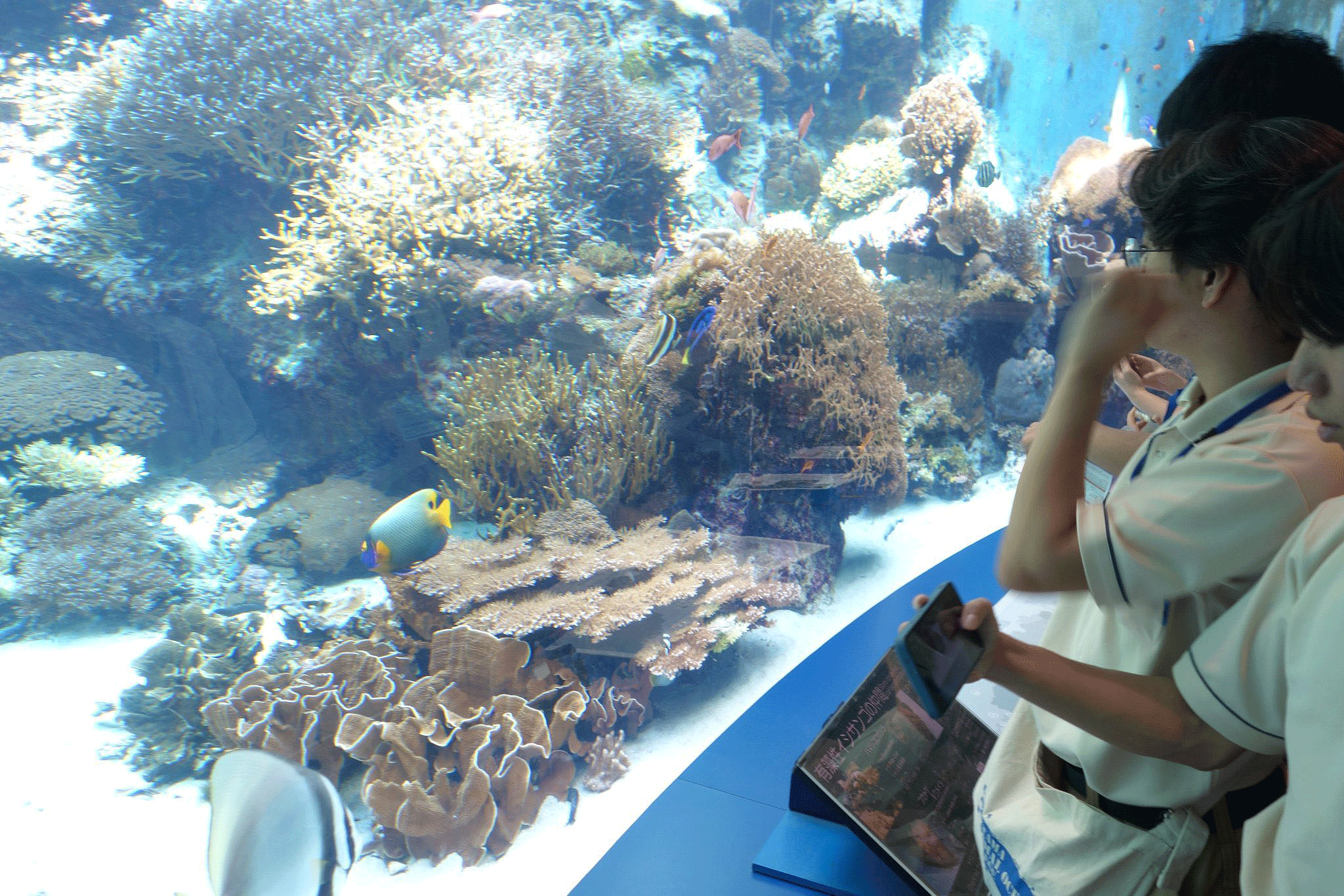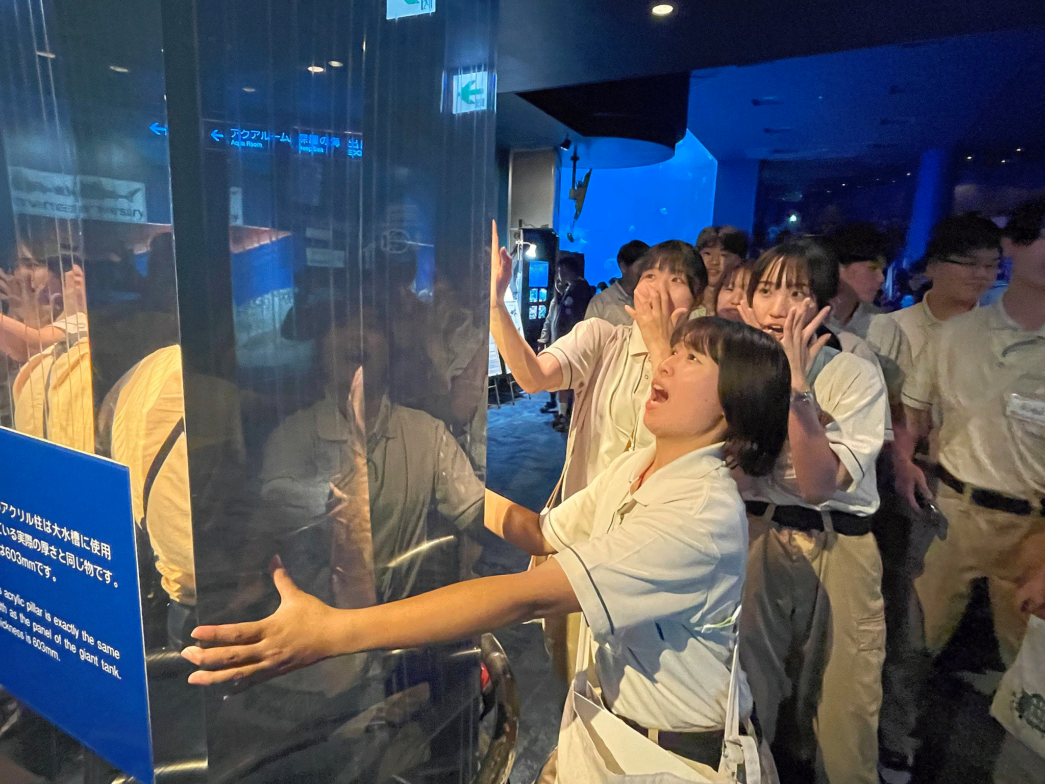 沖縄美ら海水族館では、館内見学の中で展示の工夫点、教育活動、裏側見学では、大水槽(黒潮の海)の上から回遊魚の見学と給餌方法を見学しました。またジンベイザメの搬入や水槽のシステムを見学しました。