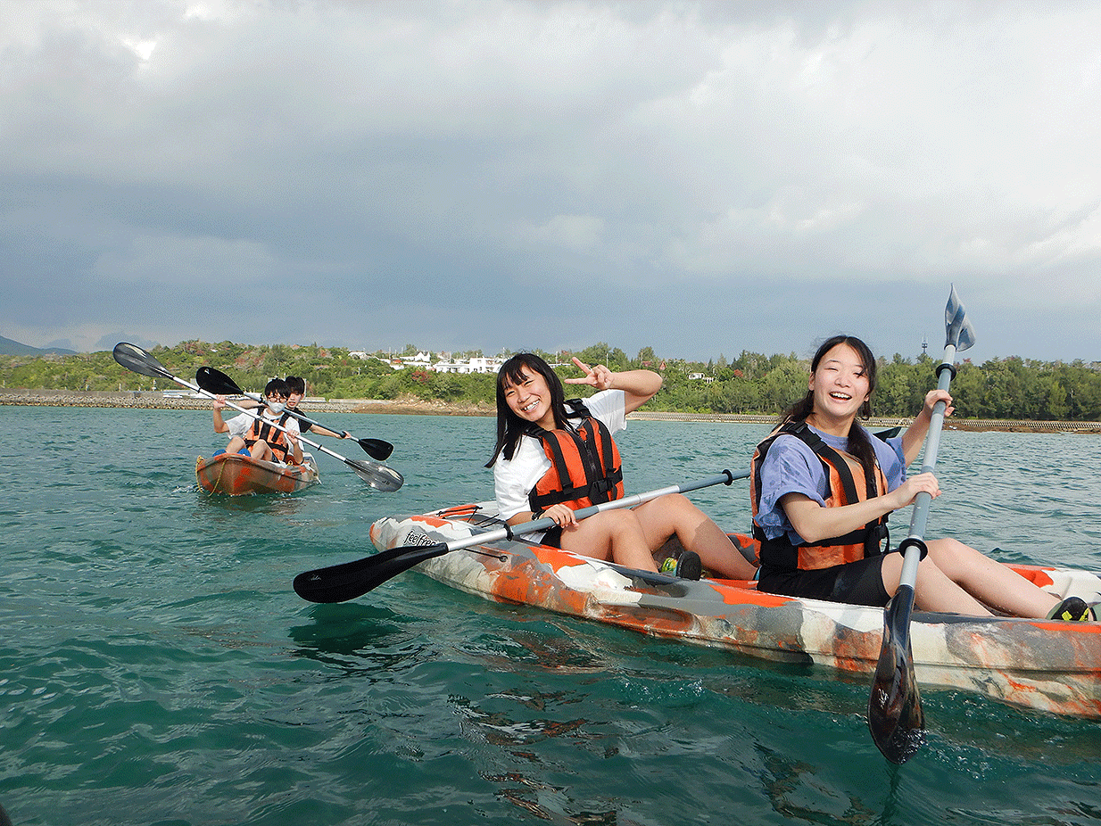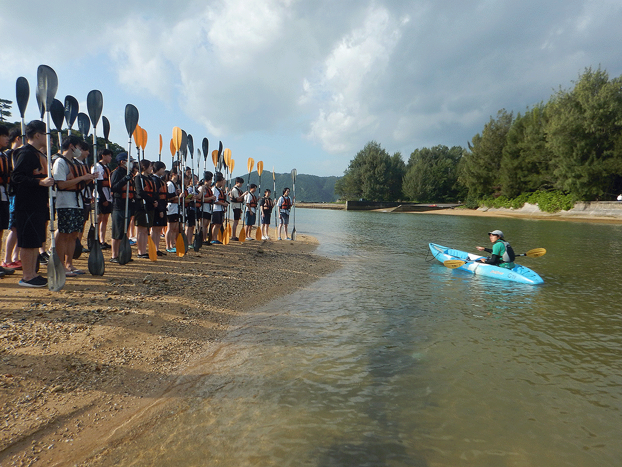 3日目の前半は、やんばる自然塾へ。やんばる自然塾では、卒業生のガイドのもと貴重な動植物も数多く生息している慶佐次川でリバーカヤックの体験、また、トレッキングを行いながら国指定天然記念物であるマングローブの観察や生物観察をしました。