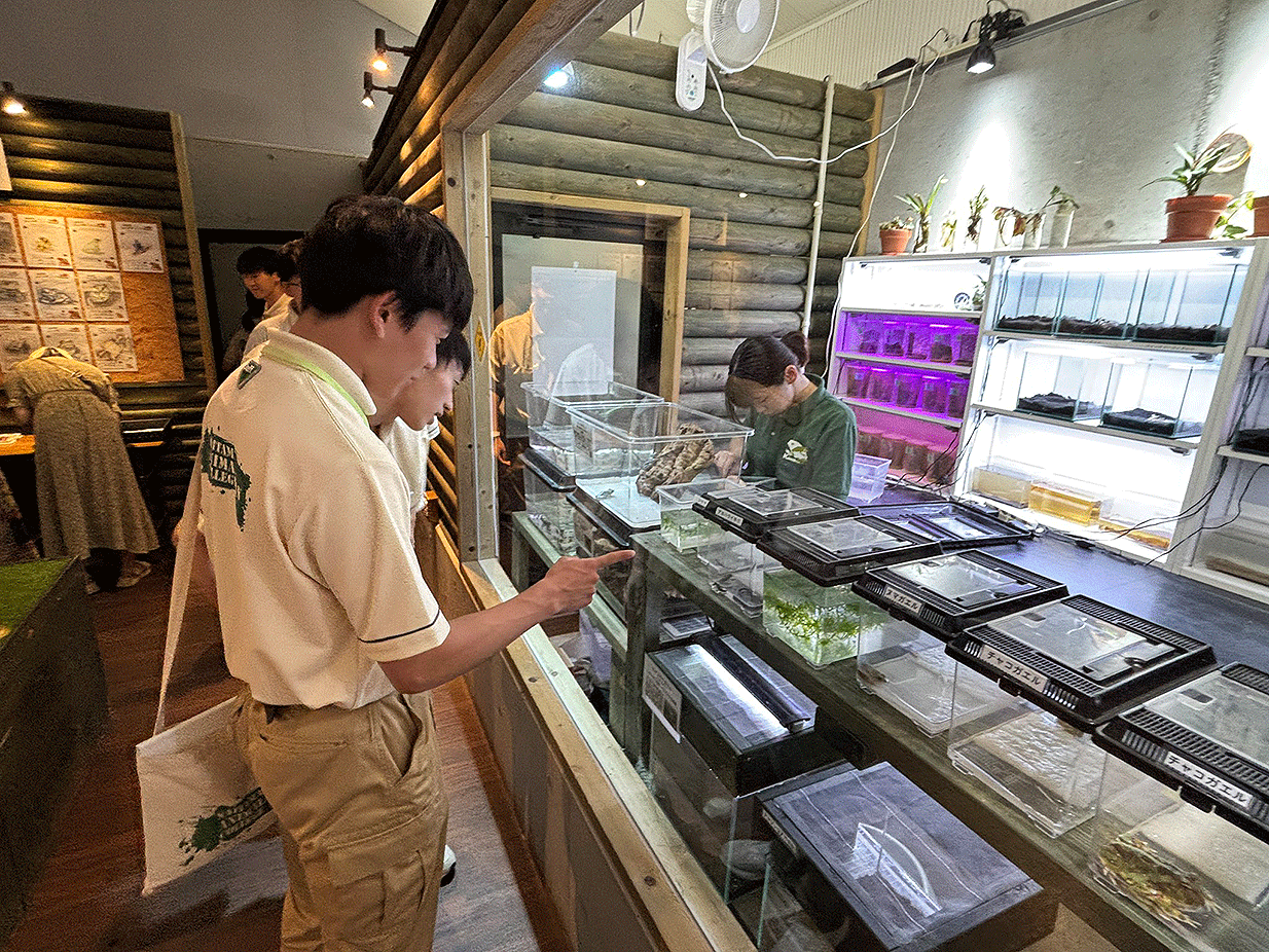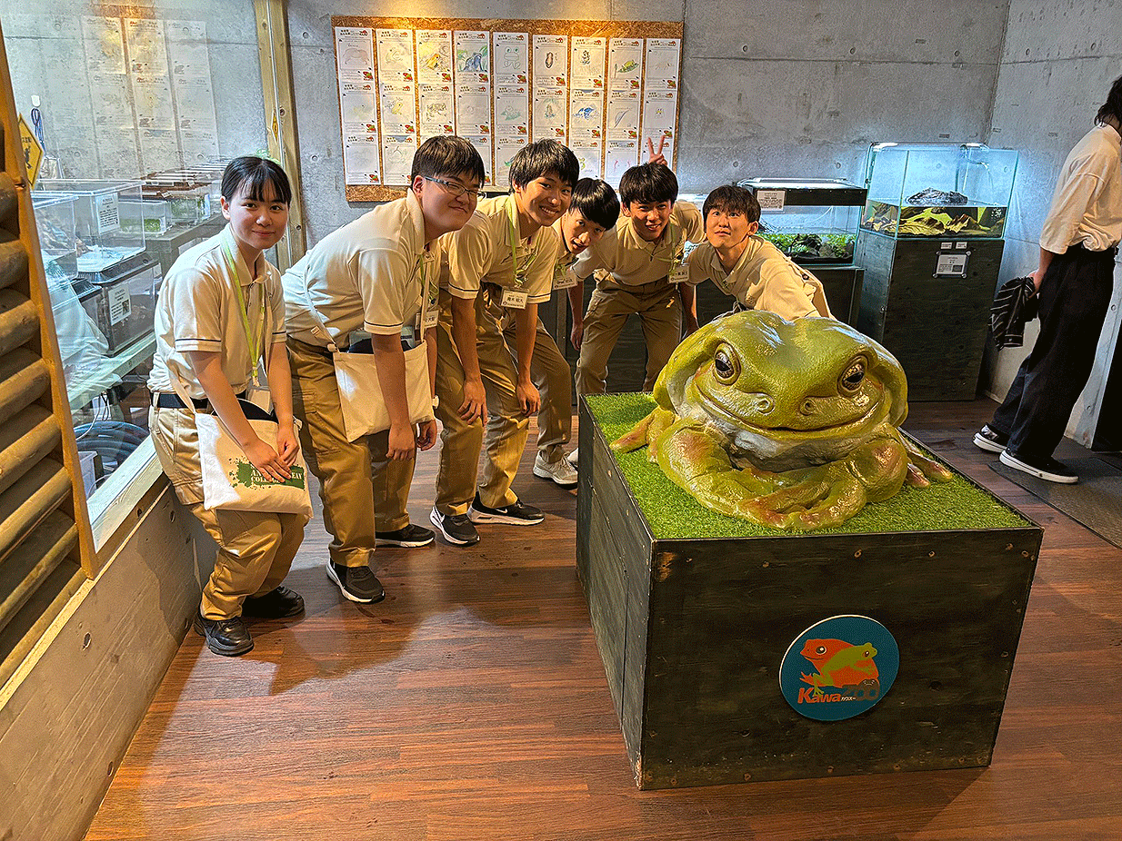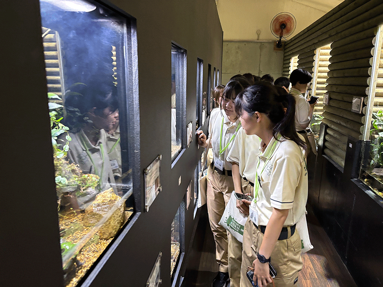 カエルの展示に特化した施設内を見学し、レイアウト方法や飼育管理について学びました。