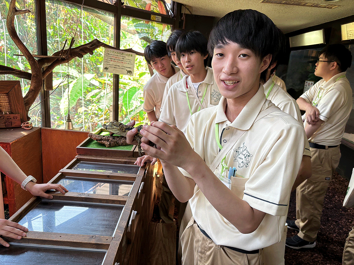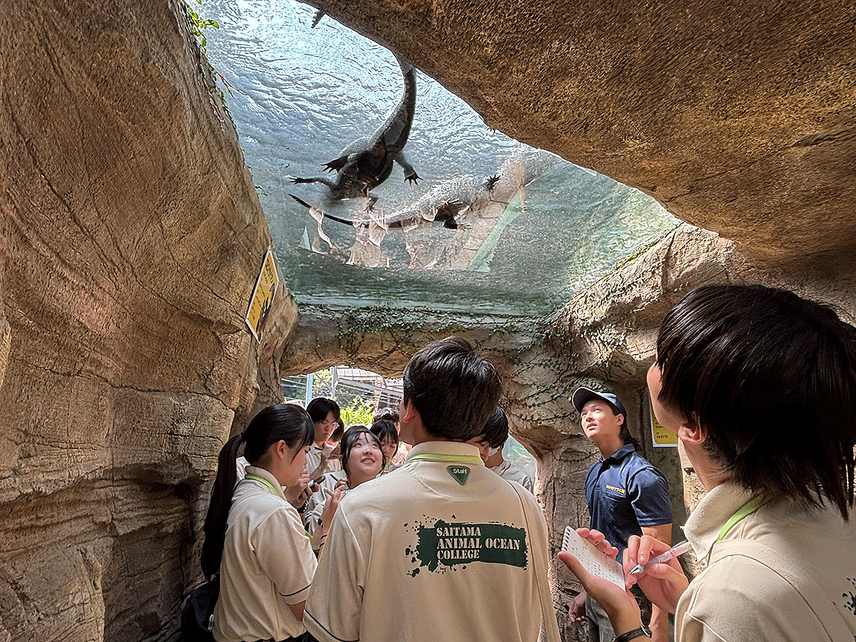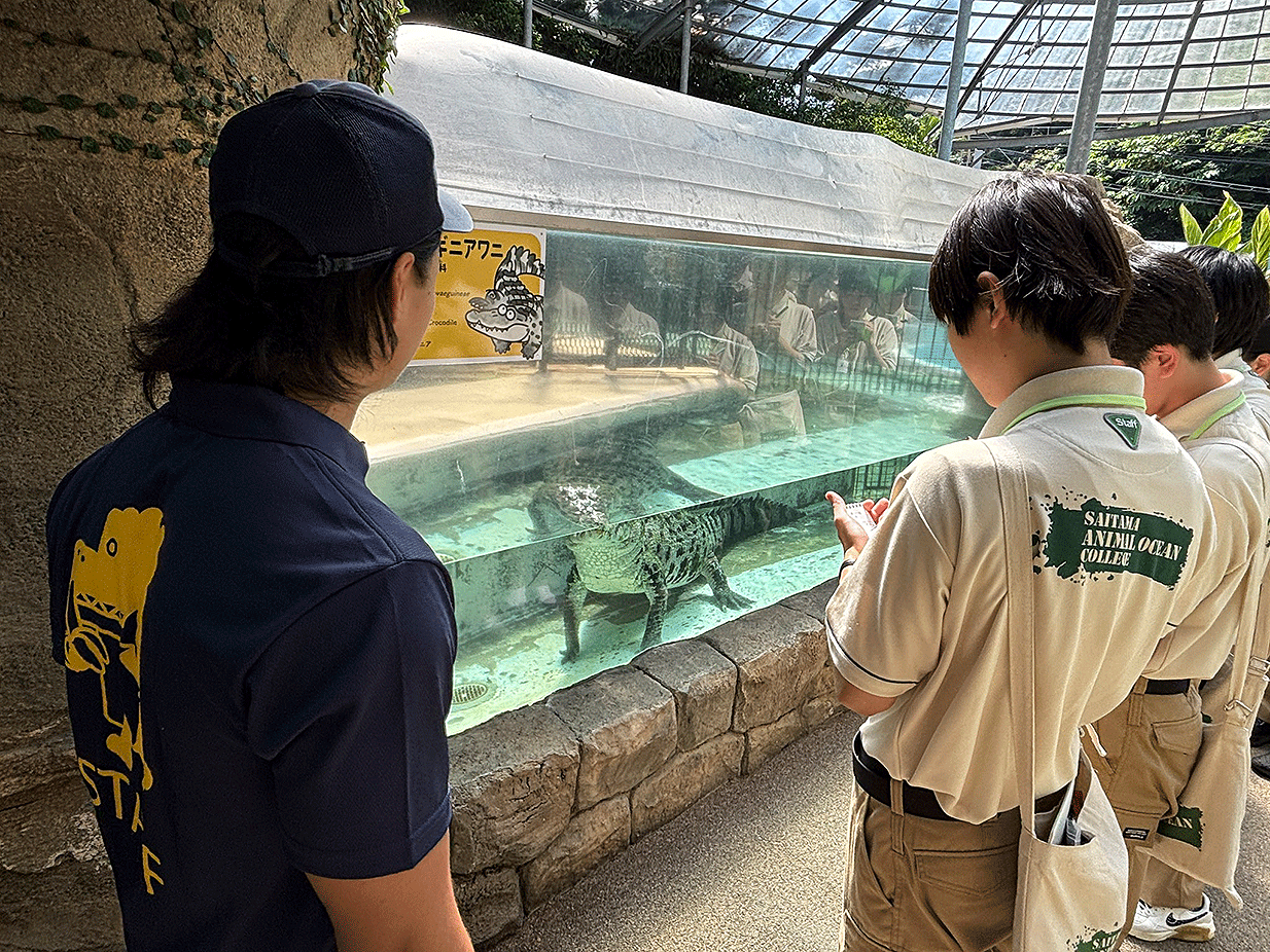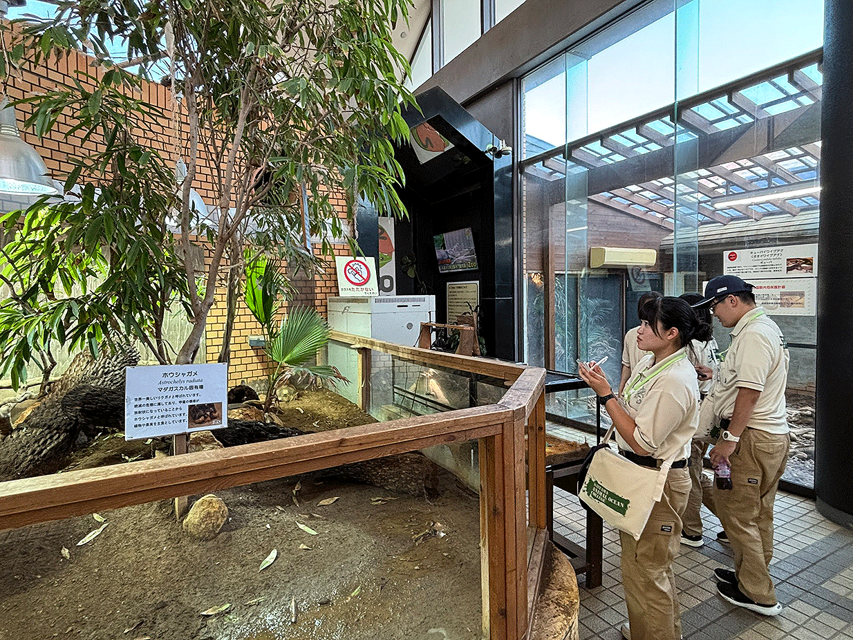 爬虫類の展示に特化した施設内を見学し、レイアウト方法や飼育管理について学びました。