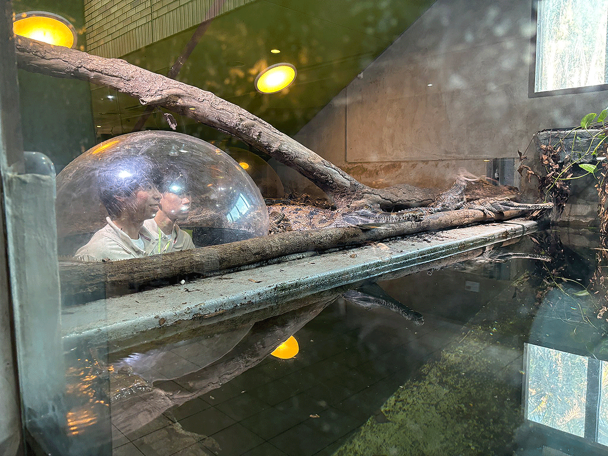 飼育課長の浜野様と菅原様よりワニの生態、飼育管理、繁殖について、アマゾンマナティの飼育管理などについてレクチャーしていただきながら園内見学を行い、有意義な研修となりました。