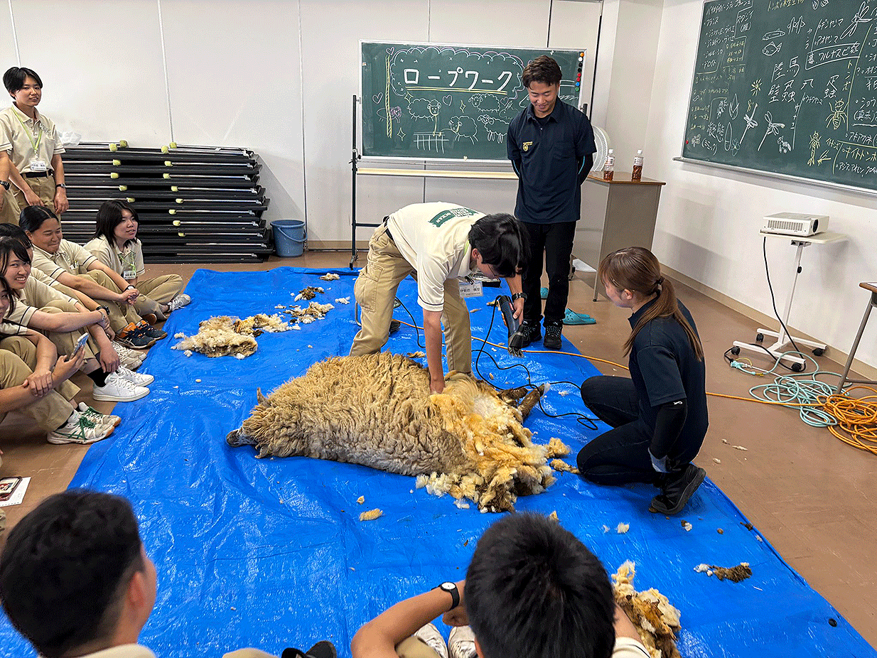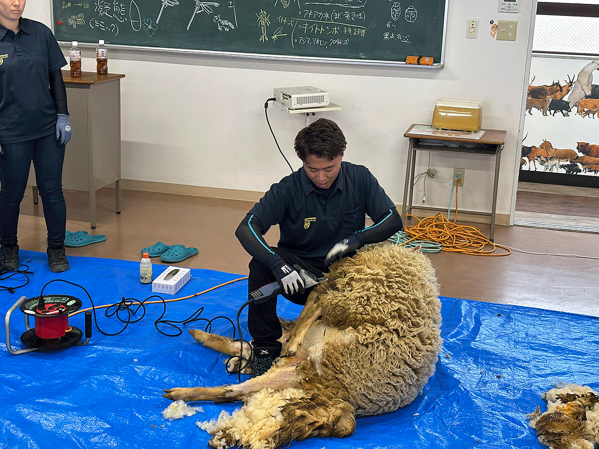 特別講義として南ヶ丘牧場の東様と関口様にお越しいただきました。道具の説明やヤギやヒツジレクチャーを受けました。最後にヒツジの毛刈り実演と体験をさせていただきました。