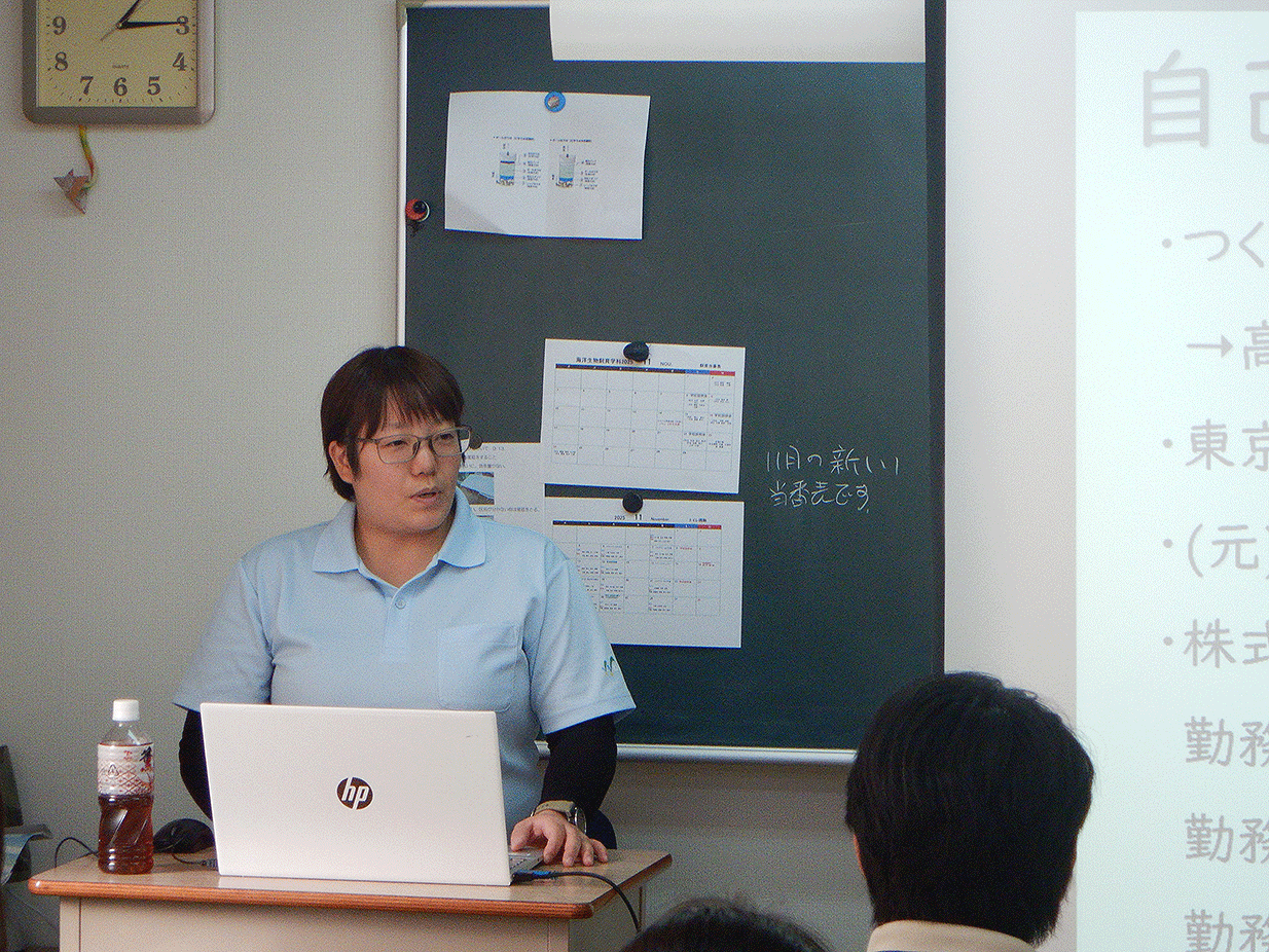 特別講義として、板橋区立熱帯環境植物館の小林様にお越しいただきました。 本館の業務内容や水族館の求める人材について、八景島系列だからこその強みや館ごとの特徴のほか、学生時代に意識していた取組などについてご講話いただきました。